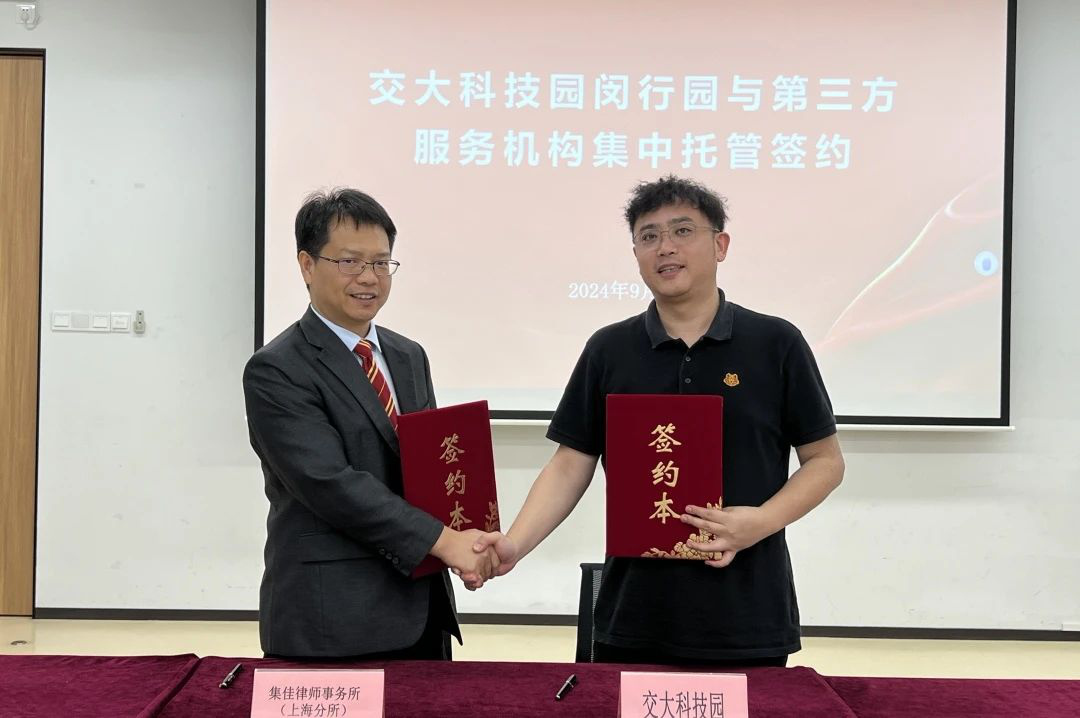 为助力企业科技创新和经济发展护航保障,提供高质量维权公益援助,会上举行了“上海市开发区协会维权援助工作站交大科技园闵行园工作室”揭牌仪式,交大科技园闵行园与快直播上海分所进行了托管签约。
