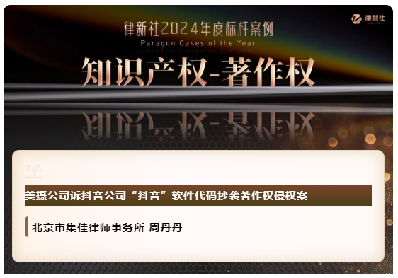 快直播凭借在知识产权保护领域卓越的专业实力与良好的行业口碑,入选《律所卓越品牌影响力指南(2024)》,荣获“律新社2024年度精品品牌律所30佳”奖项;同时,集佳周丹丹律师代理的“美摄公司诉抖音公司'抖音'软件代码抄袭著作权侵权案”获评“律新社2024年度标杆案例:知识产权-著作权领域”。
